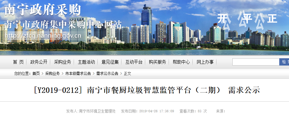 中國環(huán)聯(lián)網(wǎng)獲悉,4月26日,廣西南寧市餐廚垃圾智慧監(jiān)管平臺(二期)發(fā)布需求公示,項目預(yù)算總價572.57萬元。為保障政府采購各方當(dāng)事人的合法權(quán)益,確保政府采購公開、公平、公正。擬對南寧市餐廚垃圾智慧監(jiān)管平臺(二期) 進行公開招標 ?,F(xiàn)將采購需求進行公示,征詢各潛在供應(yīng)商的意見。1、項目預(yù)公示編號:Y...