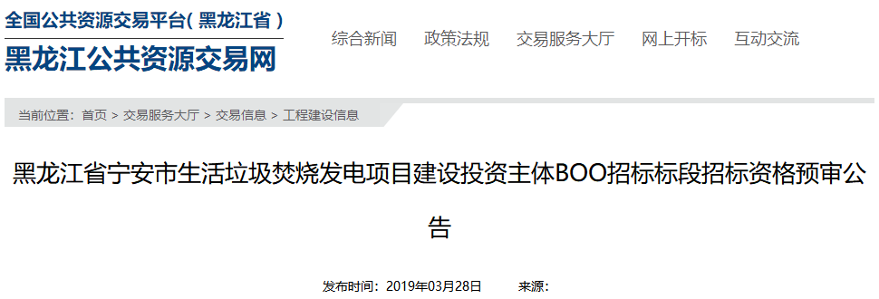中國環(huán)聯(lián)網(wǎng)獲悉,3月28日,黑龍江省寧安市生活垃圾焚燒發(fā)電項目建設(shè)投資主體BOO招標(biāo)發(fā)布資格預(yù)審公告。項目概況與招標(biāo)范圍項目名稱:黑龍江省寧安市生活垃圾焚燒發(fā)電項目建設(shè)投資主體BOO招標(biāo)建設(shè)方式:采用BOO特許經(jīng)營方式建設(shè),中標(biāo)人須按《中華人民共和國公司法》和相關(guān)企業(yè)法等國家有關(guān)法律、法規(guī)以及政策規(guī)...