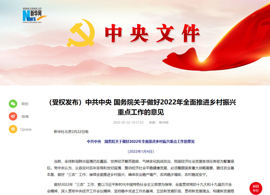 2月22日,新華網(wǎng)授權發(fā)布《中共中央 國務院關于做好2022年全面推進鄉(xiāng)村振興重點工作的意見》(又稱“2022年中央一號文件”),對2022年的“三農(nóng)”工作做出了全面部署。 一年一度的“中央一號文件”又公布了。 2月22日,新華網(wǎng)授權發(fā)布《中共中央 國務院關于做好2022年全面推進鄉(xiāng)村振興重點工作的...