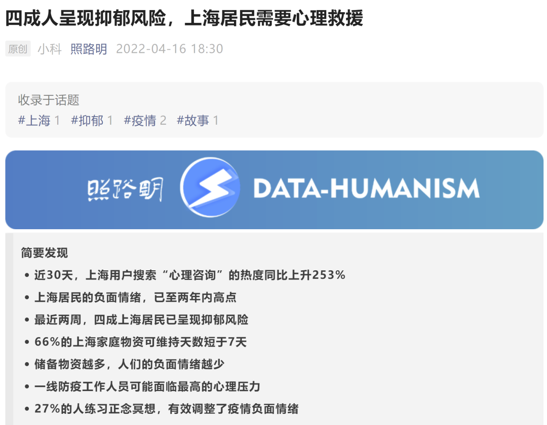 據(jù)心理領域的公眾號“照路明”,說現(xiàn)在上海疫情嚴重,大家隔離短的已經(jīng)半個多月,長的一個多月,近四成上海人呈現(xiàn)抑郁風險,需要救援。 圖片來自網(wǎng)絡 其實,這些心理救援是非常重要的。每個人碰到這種百年不遇的疫情和居家隔離,都會出現(xiàn)或多或少的心理問題。如果能打通心理咨詢熱線最好,可以聽聽專業(yè)人士的輔導。如果搶...