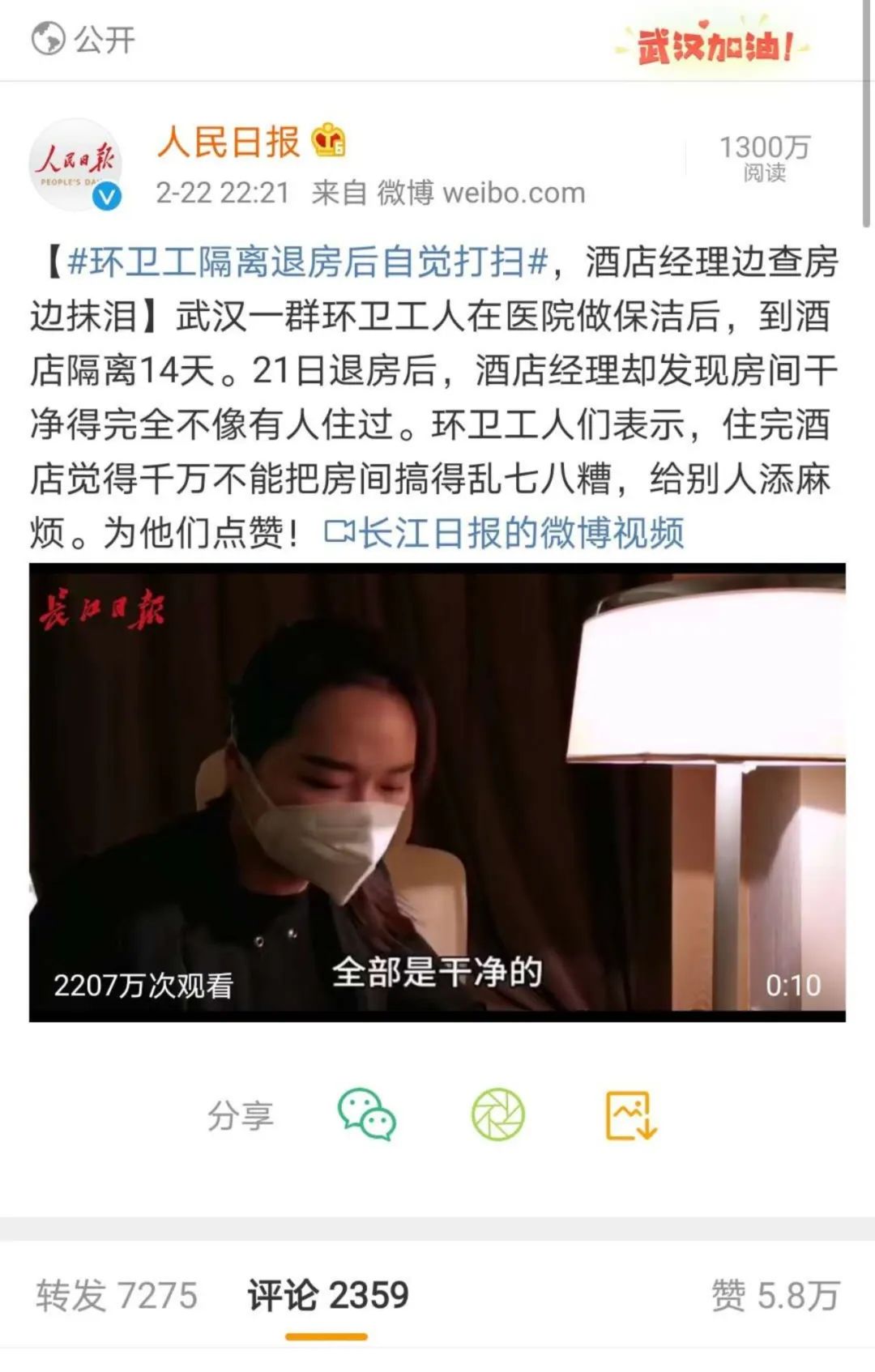 “她們也許沒有讀過(guò)很多書,干著城市最臟最累的活,沒想到她們的心靈卻那么美好!”21日晚,沌口長(zhǎng)江大酒店市場(chǎng)銷售部經(jīng)理程渝發(fā)的一條朋友圈引起大家的關(guān)注。退房后,環(huán)衛(wèi)工人自覺打掃酒店沌口長(zhǎng)江大酒店住著武漢經(jīng)濟(jì)技術(shù)開發(fā)區(qū)的兩批環(huán)衛(wèi)工人。這群環(huán)衛(wèi)工因?yàn)橹霸趨f(xié)和醫(yī)院西院保潔,出來(lái)必須要隔離14天。21日,環(huán)...