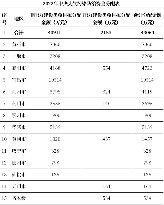 2022年4月14日,湖北省財(cái)政廳發(fā)布“關(guān)于下達(dá)2022年中央大氣污染防治資金的通知”,明確今年中央大氣污染防治資金分配情況,共43064萬(wàn)元,非能力建設(shè)類(lèi)項(xiàng)目擬分配金額40911萬(wàn)元,能力建設(shè)類(lèi)項(xiàng)目擬分配金額2153萬(wàn)元。具體分配見(jiàn)下表: 原文如下: 省財(cái)政廳關(guān)于下達(dá)202...