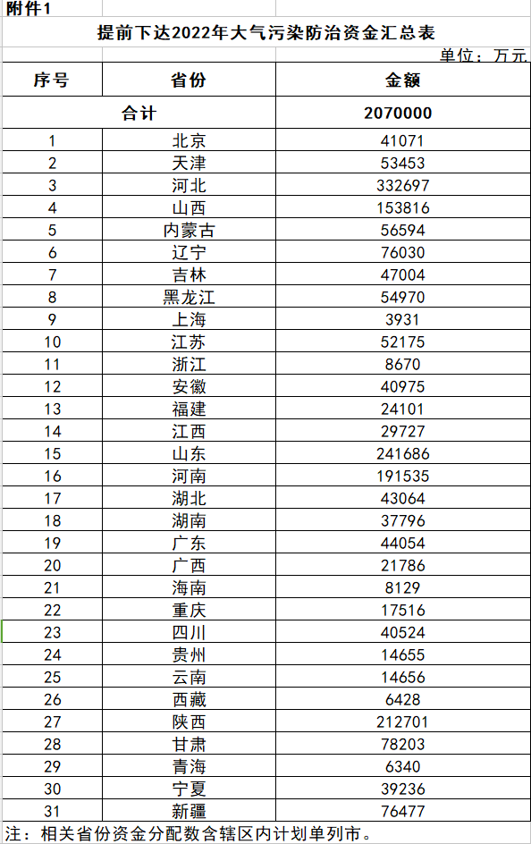 財政部關(guān)于提前下達(dá)2022年大氣污染防治資金預(yù)算的通知 財資環(huán)〔2021〕114號 各省、自治區(qū)、直轄市財政廳(局): 為支持大氣污染防治工作,促進(jìn)大氣質(zhì)量改善,現(xiàn)下達(dá)你省(自治區(qū)、直轄市,以下簡稱省)2022年大氣污染防治資金,用于支持開展減污降碳等方面相關(guān)工作,并就有關(guān)事項通知如下: 一、各省安...