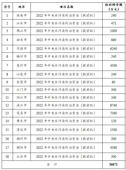 廣東省生態(tài)環(huán)境廳關(guān)于2022年中央水污染防治資金(提前批)、大氣污染防治資金(提前批)安排計劃的公示 經(jīng)廳黨組會議、廳務(wù)會議審議通過,我廳擬申請?zhí)崆跋逻_(dá)2022年中央水污染防治資金36671萬元、大氣污染防治資金44054萬元。 按照《廣東省省級財政專項資金管理辦法(試行)》(粵府〔2018〕120...