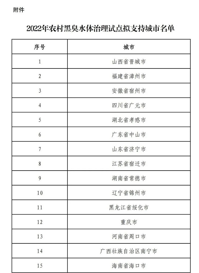 今年3月,財(cái)政部、生態(tài)環(huán)境部通知開(kāi)展2022年農(nóng)村黑臭水體治理試點(diǎn)工作,6月10日,財(cái)政部對(duì)2022年農(nóng)村黑臭水體治理試點(diǎn)支持城市名單予以公示。文件擬將15個(gè)城市確定為2022年支持的農(nóng)村黑臭水體治理試點(diǎn)城市,包括山西晉城市、安徽宿州市、湖北孝感市、廣東中山市、重慶市等。 目前,該名單仍處于公示期內(nèi)...