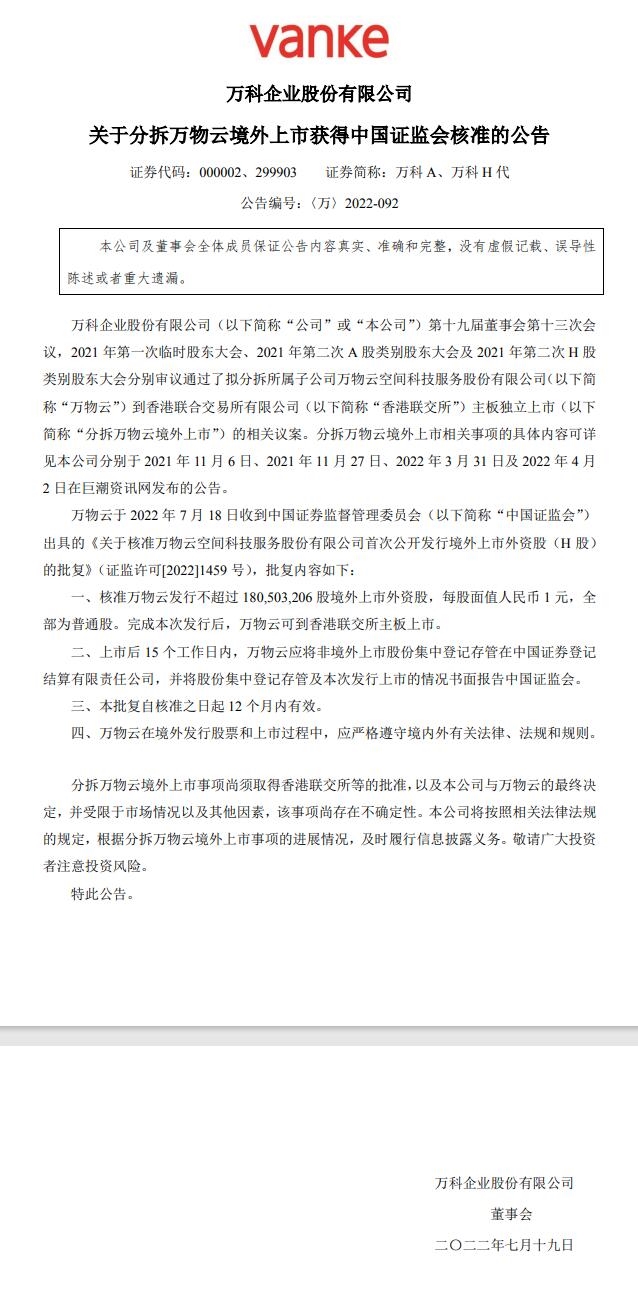 2022年7月18日晚間,萬科發(fā)布公告稱,分拆子公司萬物云空間科技服務(wù)股份有限公司到香港聯(lián)交所主板上市一事已獲中國證監(jiān)會(huì)核準(zhǔn)。 核準(zhǔn)萬物云發(fā)行不超過 180,503,206 股境外上市外資股,每股面值人民幣 1 元,全 部為普通股。完成本次發(fā)行后,萬物云可到香港聯(lián)交所主板上市。 據(jù)悉,萬物云一般經(jīng)營...
