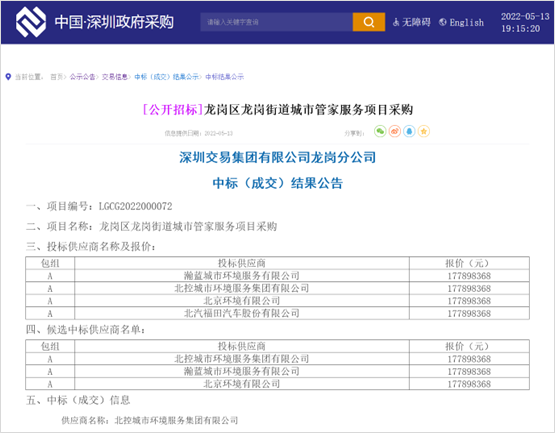 兩標(biāo)20億元,北控城市服務(wù)“城市大管家”之路越走越寬廣。深圳政府采購網(wǎng)消息,2022年5月13日,深圳市龍崗區(qū)平湖街道城市管家服務(wù)項(xiàng)目公布中標(biāo)結(jié)果,在與北京環(huán)境有限公司、瀚藍(lán)城市環(huán)境服務(wù)有限公司、北汽福田汽車股份有限公司的同場較量中,北控城市環(huán)境服務(wù)集團(tuán)有限公司成功勝出。成交信息如下:供應(yīng)商名稱:北...